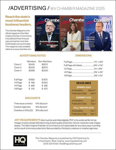 The Chamber Magazine presents advertisers with an opportunity to reach the most influential business leaders in West Virginia.